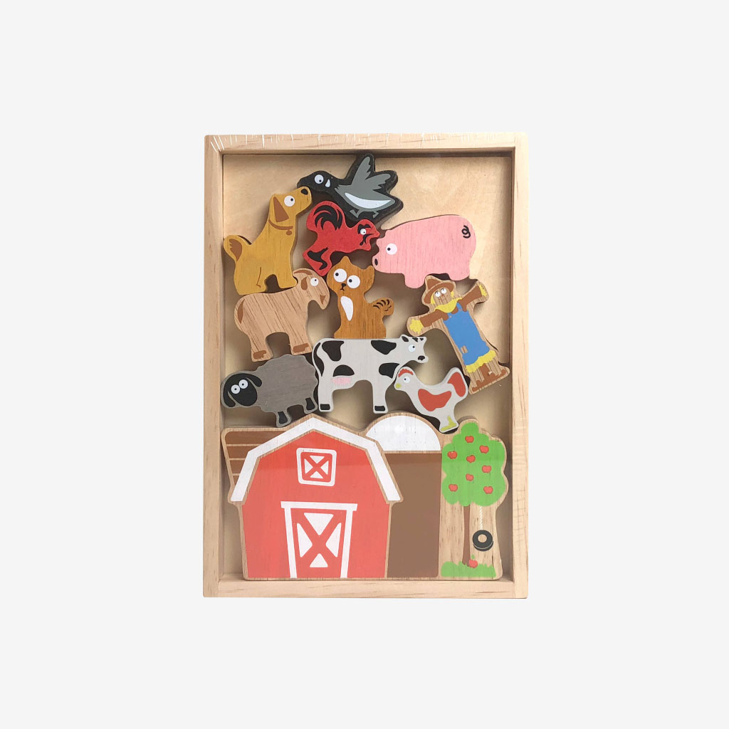 12 all-natural wood pieces painted with bright, bold colors, and 1 barn to balance them on. Stack fun farm shapes like the horse, cow, pig, puppy, rooster, sheep, duck, kitty, and goose.