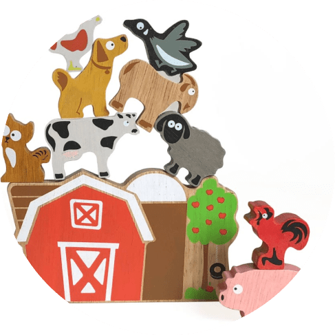 The Balance Barn game and playset offer a fun family stacking game and farm character playset – all in one! Kids love to play with the farm characters telling their own stories, and families can play a simple yet fun stacking game together.