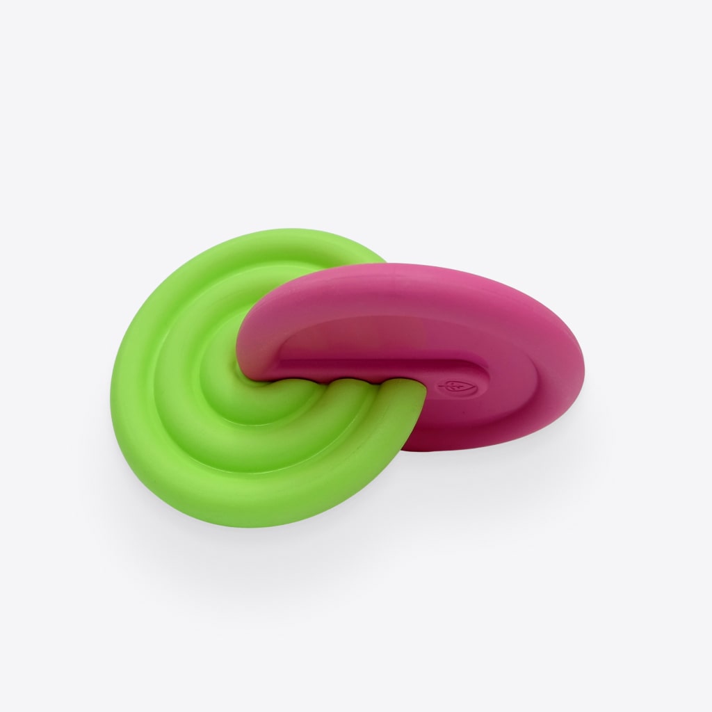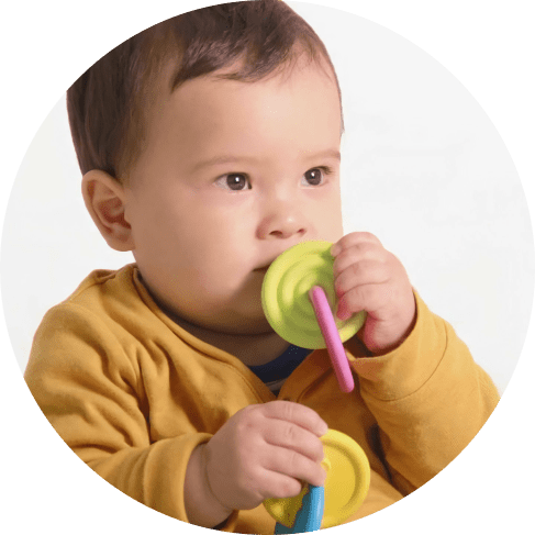 The contrasting pink and green colors of the disks are pleasant to your baby’s eyes. The toy is sized just right for a baby’s hands to manipulate. The toy can be chilled in the refrigerator. When necessary, wash by hand or simply put it in the dishwasher.