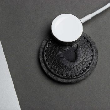Provide your Apple Watch with a home on your desk with the luxurious Apple Watch Pad. Rich black pebbled leather is formed in a raised circle shape with contrast color stitching.