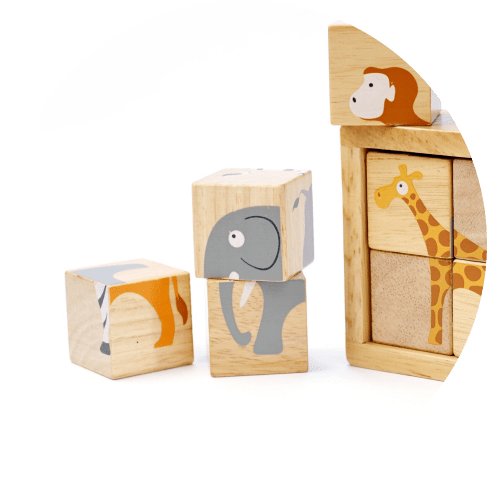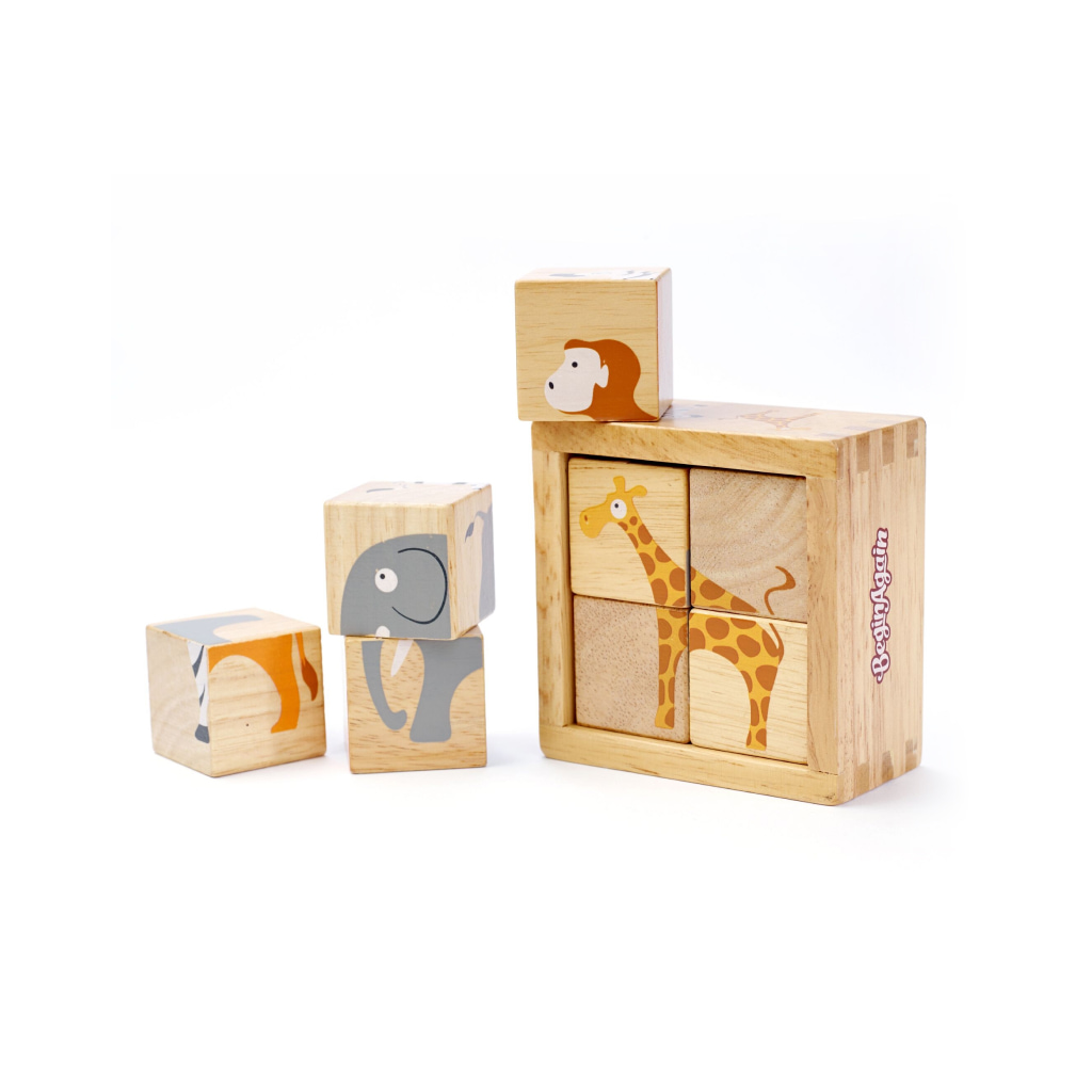 The Buddy Blocks features six different animal designs printed on each side of the four puzzle cubes. Accurately match all four sides to reveal the animal!