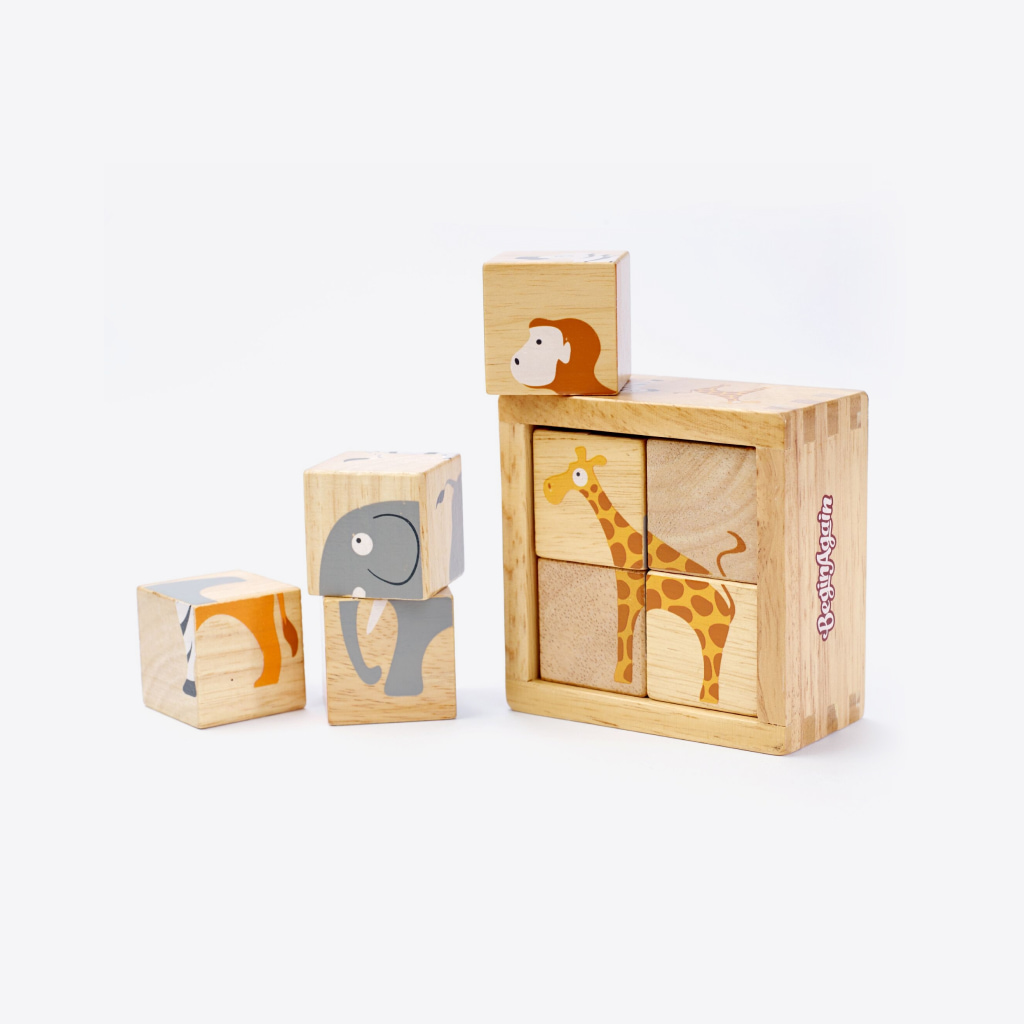 This 4-piece block set will please animal-crazy kids and their eco-minded parents. Mix and match the blocks and solve 6 animal puzzles with this great set! Made from rubberwood and colored with child-safe stains, the playset develops the creative thinking and problem-solving skills.