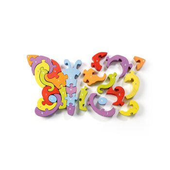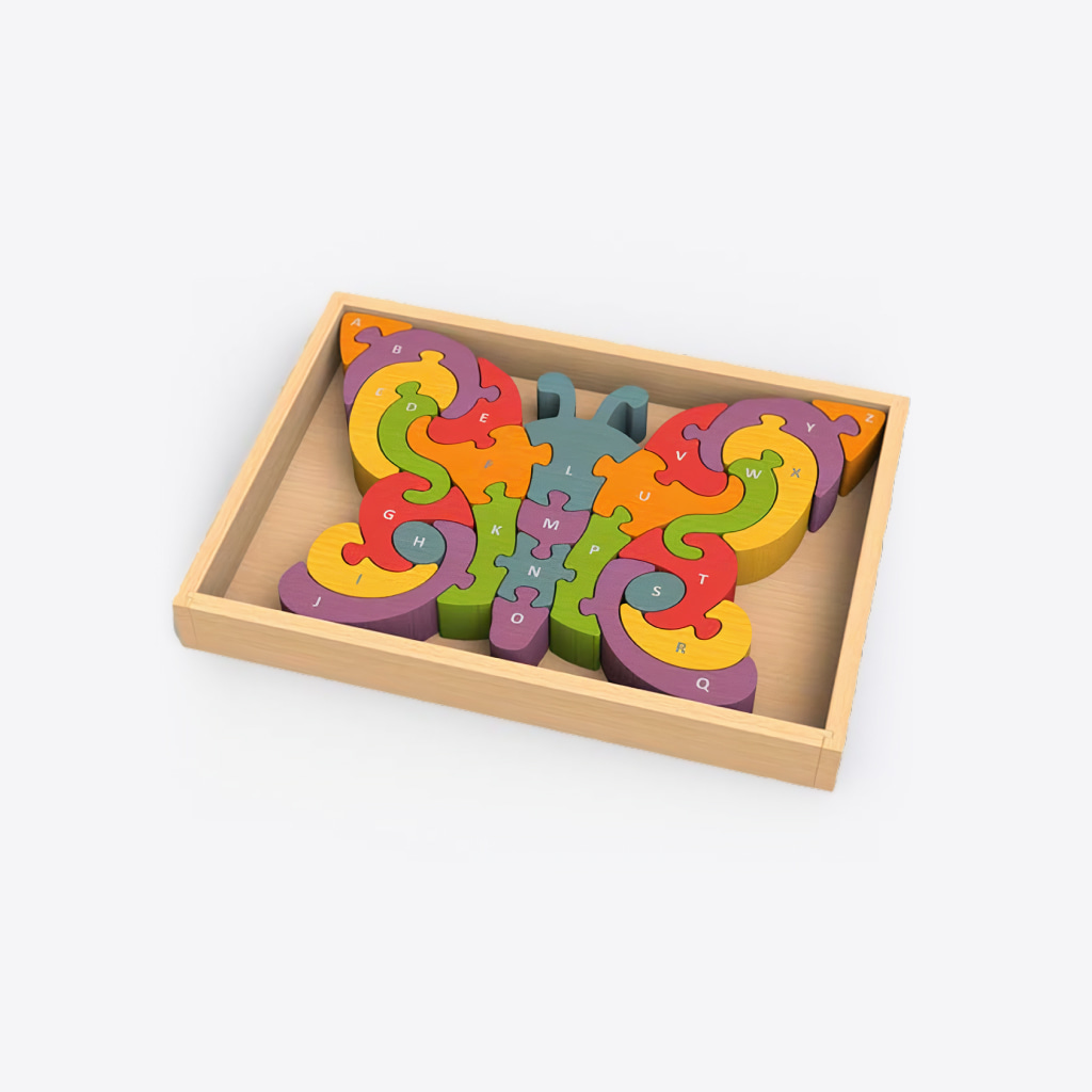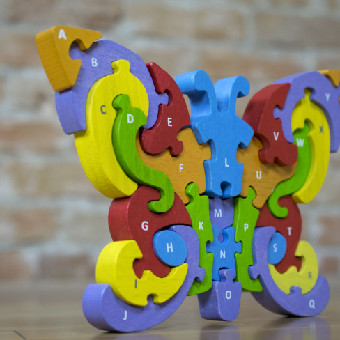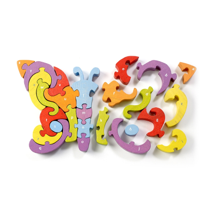 Butterfly A to Z Puzzle by BeginAgain is a natural wooden toy, handcrafted from plantation-grown rubberwood, stained with child-safe, non-toxic dyes.