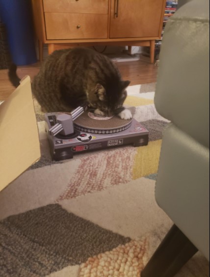 Saw this scratcher on someone’s Twitter feed and had to get one. My cats love it. I add catnip to it periodically and they love it even more. My one cat gets sad when the other cat takes a turn! Not just another unused cat purchase.