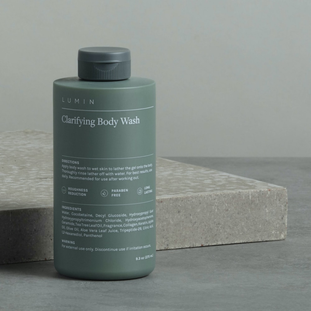 Clear up, moisture up — and feel (and look) better. The Lumin Clarifying Body Wash combines antifungal tea tree leaf oil with moisturizing aloe vera and ceramide for more resilient and healthier skin all over.