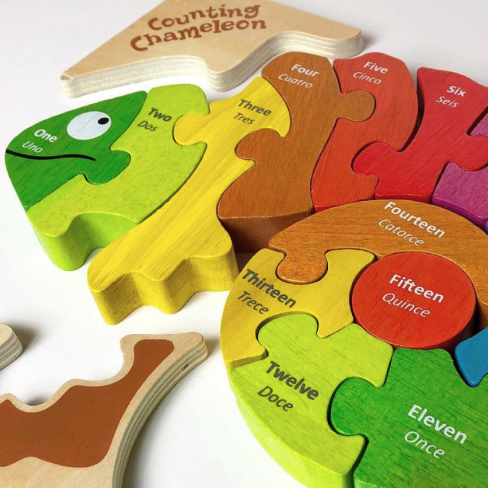The Counting Chameleon Puzzle is a natural wooden toy, handcrafted from plantation-grown rubberwood, stained with child-safe, non-toxic dyes. By making children’s puzzles out of plants, not plastic, BeginAgain is contributing to a healthier planet and healthier kids.