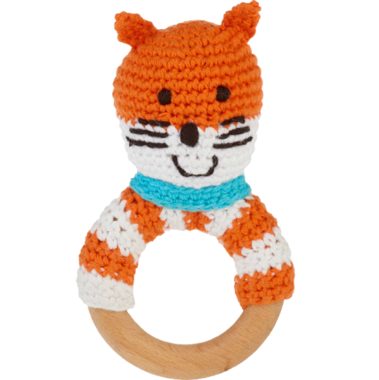 Featuring our sly but lovable fox and a teething ring made of beech wood, this handmade rattle is as colorful as it is playful. Size: 5″ (L) x 3.25″ (W).
