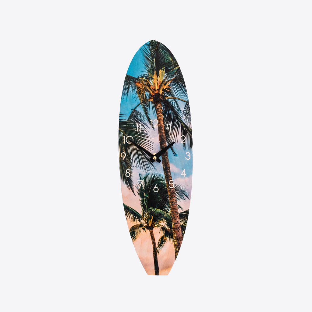 Imagine yourself sitting with your toes in the sand under a beautiful palm tree watching the people walk by and the waves crash on the shore. The smell and feel of the ocean air on your face. This scene makes for a beautiful beach house decor. That’s why we’ve captured it in our beautiful Hawaiian Palms wall clock! Every time you check the time, it’ll make you relive your happy holidays memories!