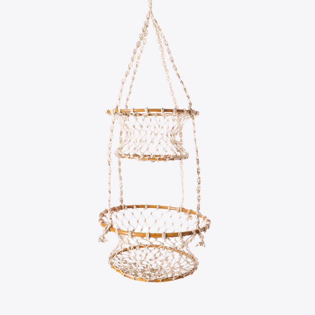 Jute and natural wood come together in this 100% natural, handcrafted Jhuri Double Hanging Basket that can hold plants, flowers, and knicknacks alike.