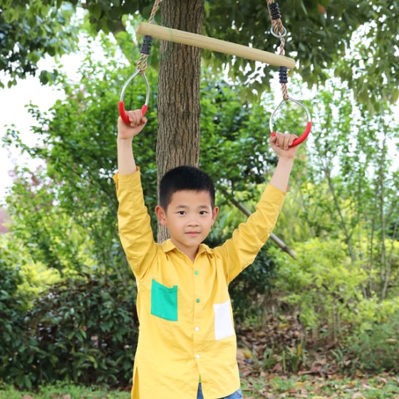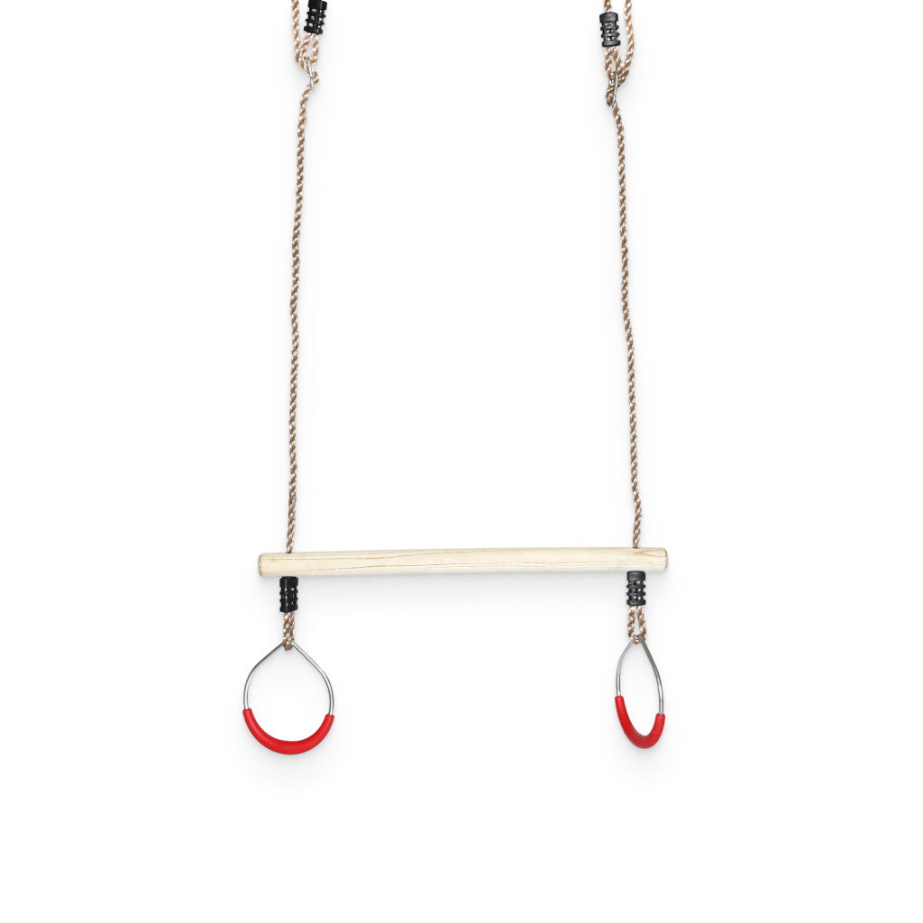Add a gymnastic element to your child’s swing set. Kids will find multiple ways to swing on this gym ring and trapeze bar combination swing and will enjoy hours of fun and laughter. Its sturdy wooden bar and non-slip rings make it easy to swing like an acrobat!
