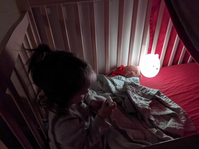 My 2-year-old loves this. It is a bit bright for a night light, but if you set it on a dim color like red or orange it isn’t so bad.