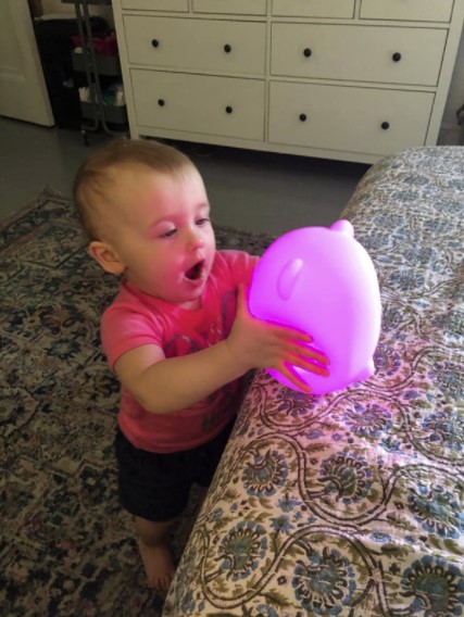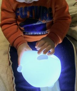 Our 2-year-old is starting to be able to climb out of his crib, so we wanted to have a light to at least keep him from hurting himself doing so. This light is pretty adorable, and it’s got an impressive amount of settings and features (can set to stay at one color, to cycle abruptly to different colors, to fade into different colors, 3 timer settings or it can just be left on indefinitely). If needed I would feel safe leaving this in the crib with our son. It’s very soft and almost squishy, rubbery plastic and presents no choking hazards. Some of the colors are brighter and more saturated, while others are soft and dim. Since you are able to select a constant color, it gives options for how bright the room will be during nap/sleep time. There are even 2 settings for white (one bright, one dim). This thing really is awesome. I can’t attest to the battery life at this point but we plan to just leave it plugged in all the time anyway.