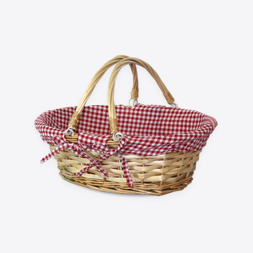 This oval willow basket with double drop down handles has the following approximate dimensions: 13″ x 10.25″ x 4.75″