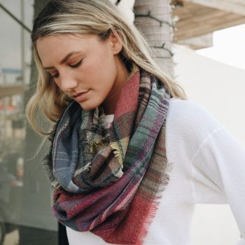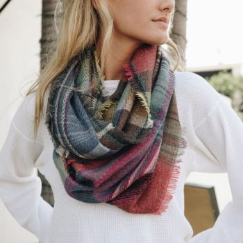 The plaid infinity scarf measures 34″ x 18″, big enough to wear like a chunky scarf or around your shoulders like a shawl or wrap.