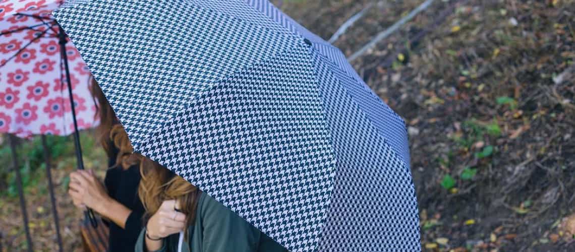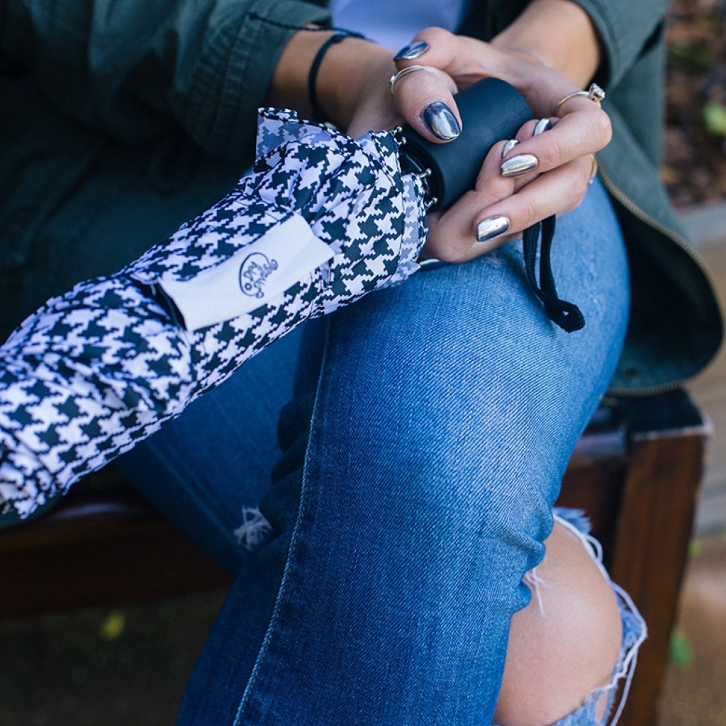 Includes an easy fit sleeve. Plus, the Rockin Houndstooth umbrella has a compact size (10.5 inches closed), making it easy to fit in your handbag or car.