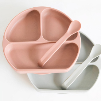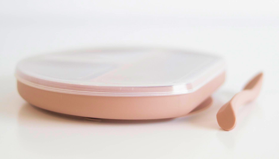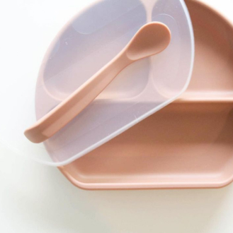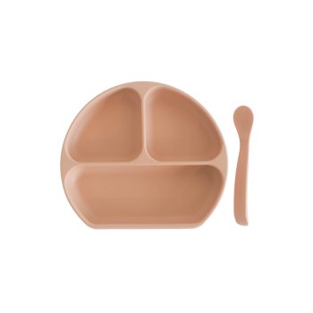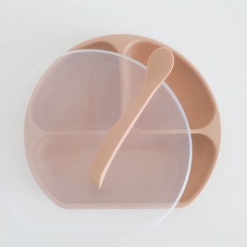 This stylish divider plate and spoon set gives children more independence at mealtimes and is perfect for learning to self-feed. The strong suction base ensures that the plate stays in place and does not land on the floor. It comes in a stylish peach color and includes a silicone lid that allows the plate to double as a snack tray or storage container.