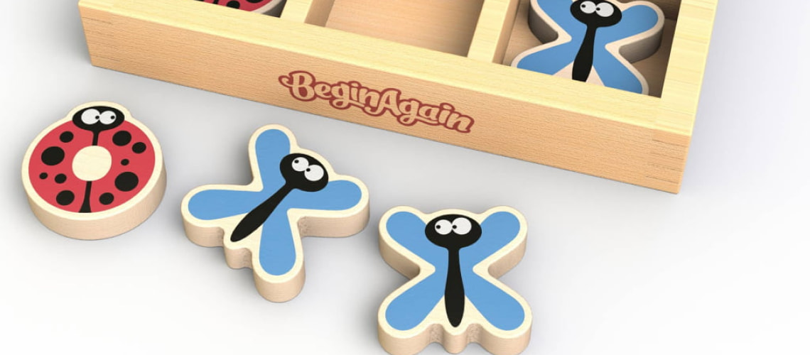 The BeginAgain travel-sized tic-tac-toe game is a two player game which includes five dragonflies and five ladybugs with a wooden tic-tac-toe grid. There is also a lid that fits across the top to keep pieces safe while traveling.